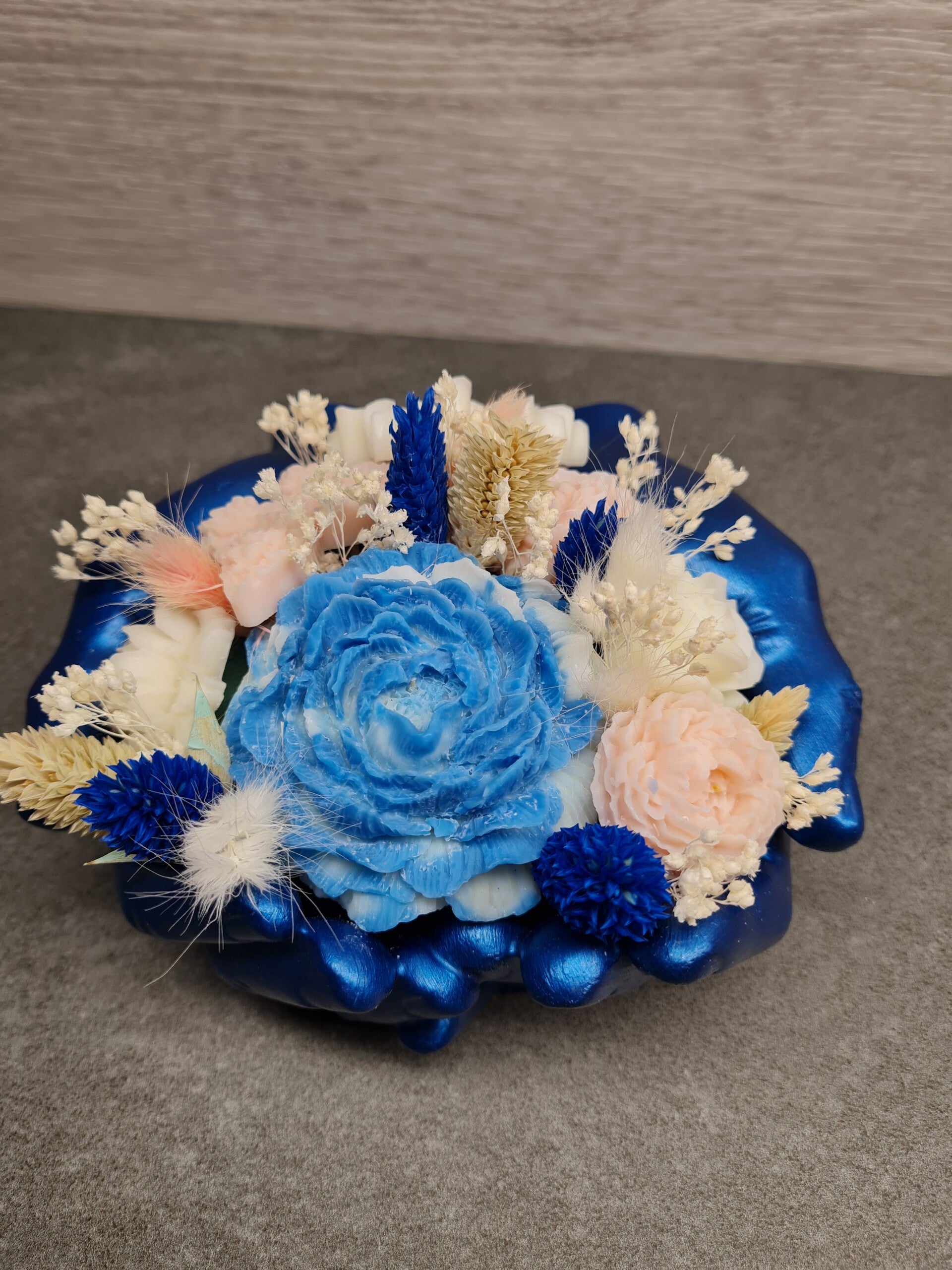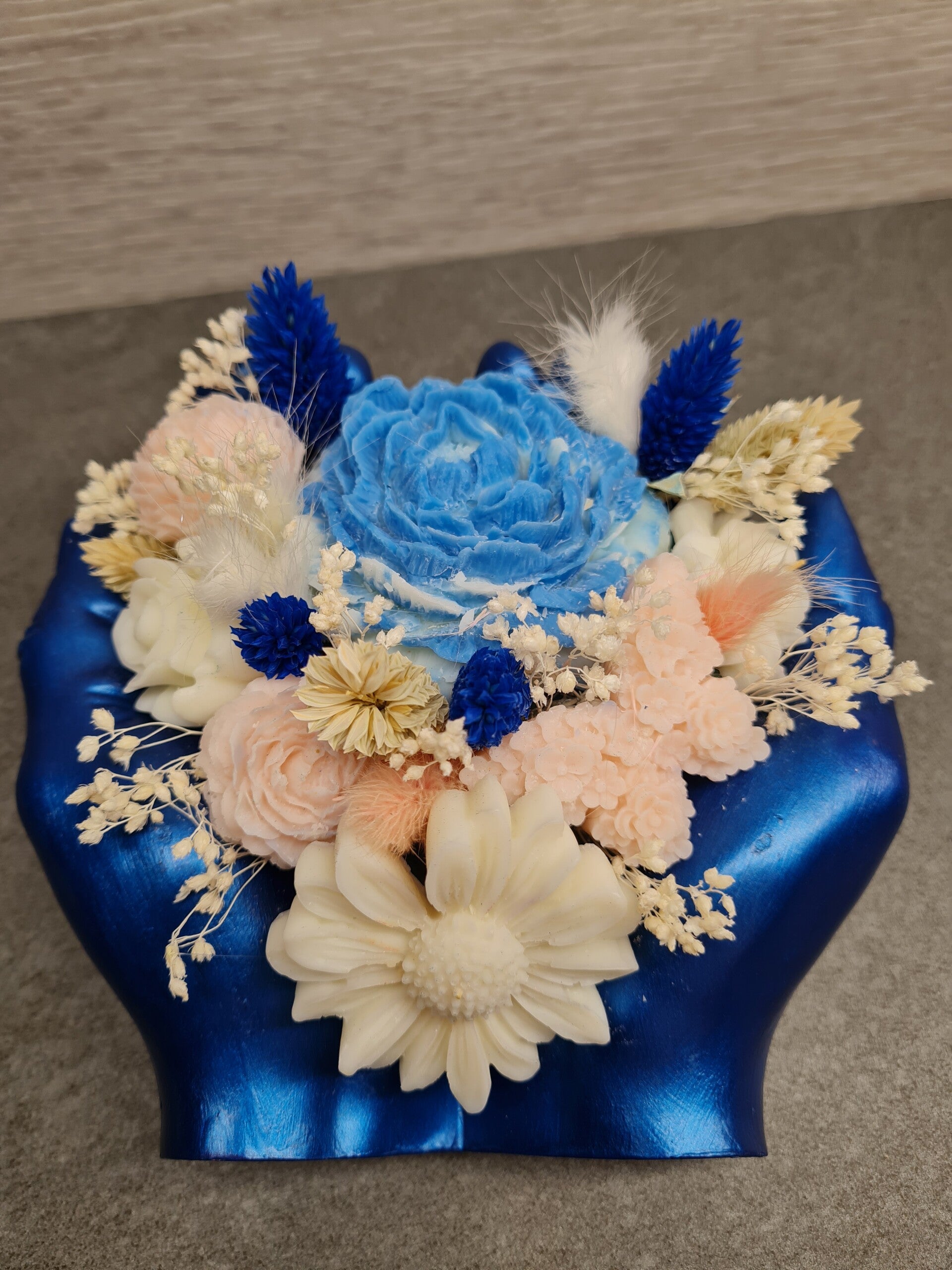 Ein elegantes Arrangement in einer besonderen Präsentation: Dieses Blumengesteck ruht in kunstvoll gestalteten Händen mit edlem Blau-Metallic-Finish. Die zarten Rosé-, Weiß- und Hellblautöne der Blüten verleihen dem Ensemble eine sanfte, beruhigende Ausstrahlung – perfekt als stilvolle Tischdekoration, Geschenkidee oder persönlicher Akzent in deinem Zuhause.