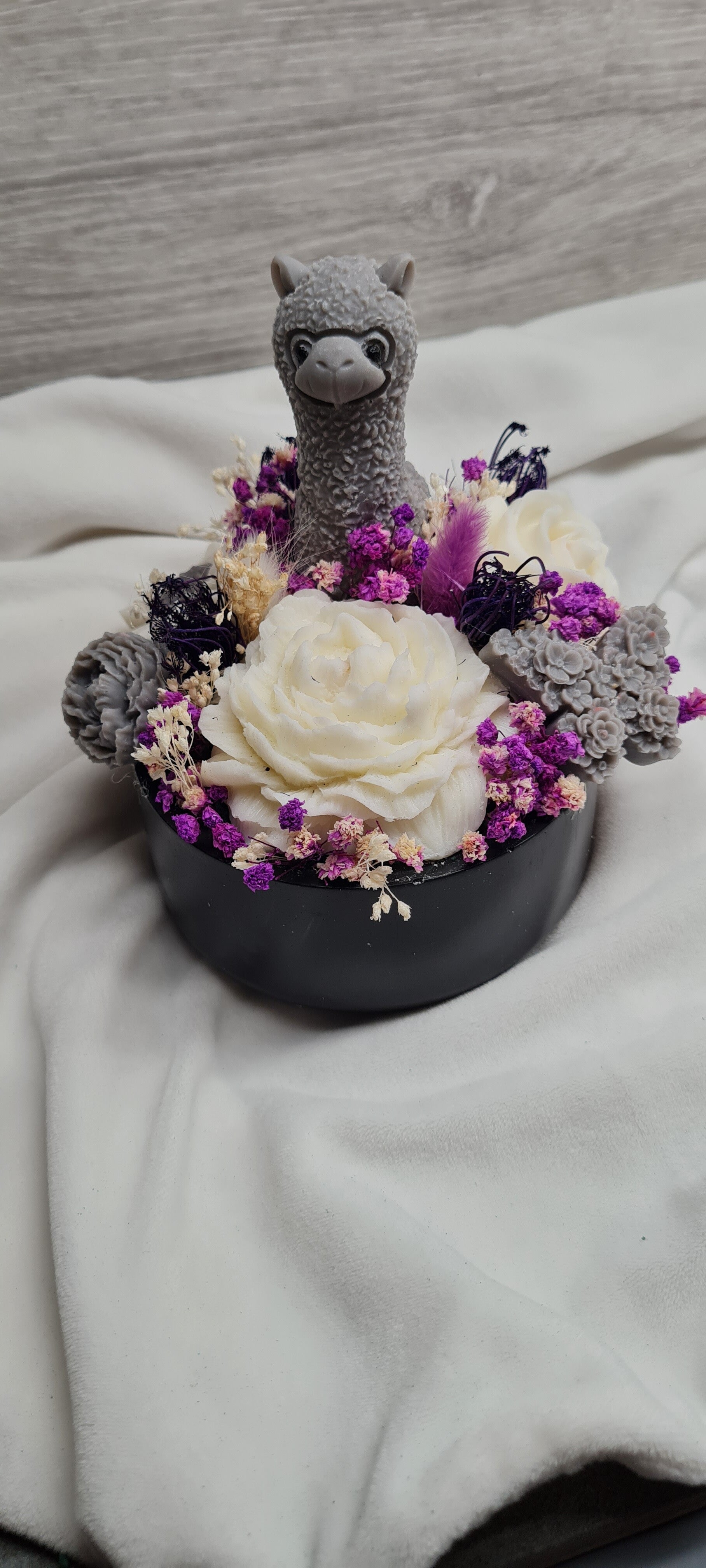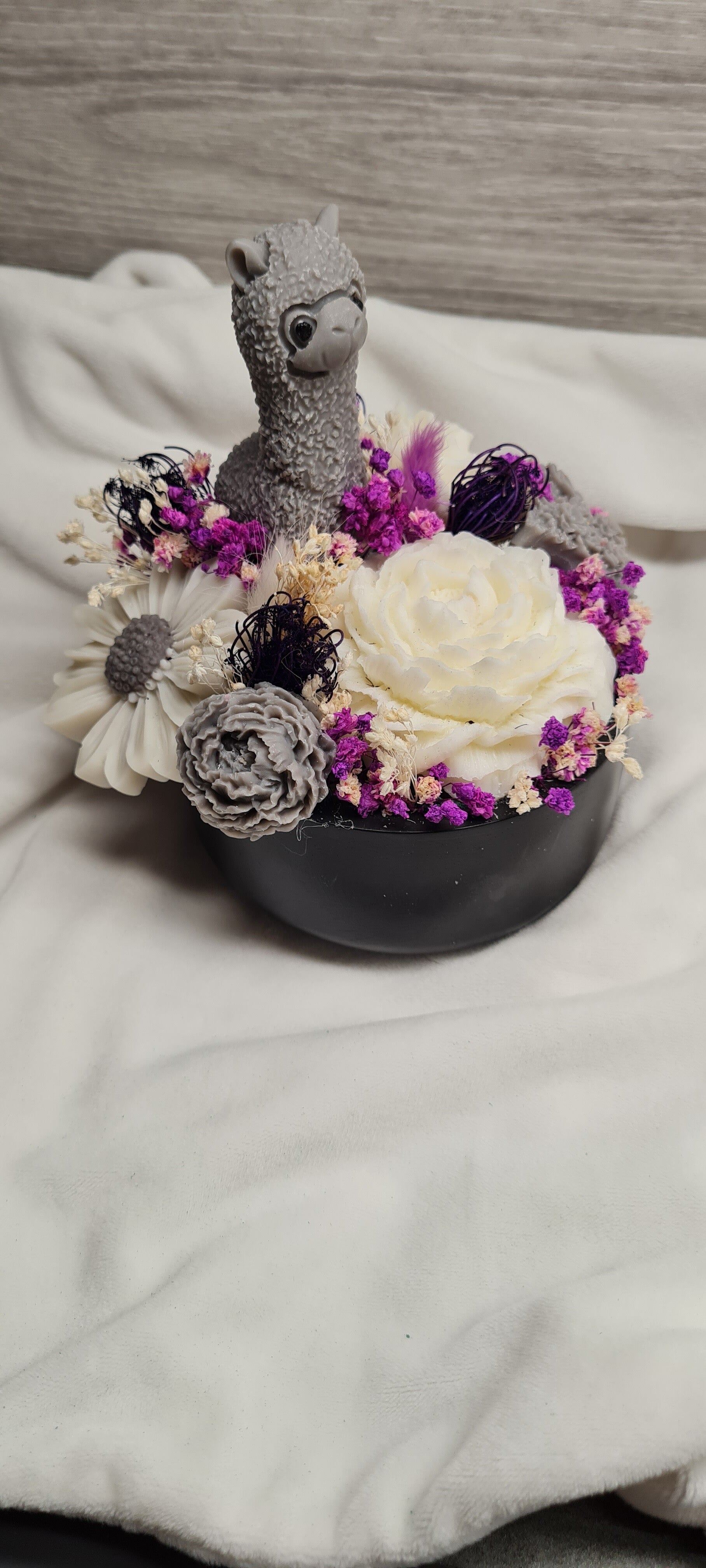Unser liebevoll gestaltetes Blumengesteck „Alpaka“ vereint Lila-Töne mit edlem Weiß und beruhigendem Grau – ein harmonisches Arrangement, das Stil und Sanftheit ausstrahlt. Ideal als Tischdeko, Geschenk oder Blickfang in deinem Zuhause. Das süße Alpaka sorgt für einen charmanten Akzent und bringt ein Lächeln in jeden Raum.