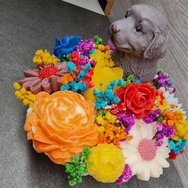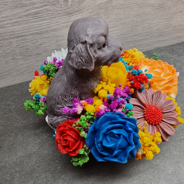 Ein Hauch Natur, ein Hauch Design – Blumengesteck mit Hund