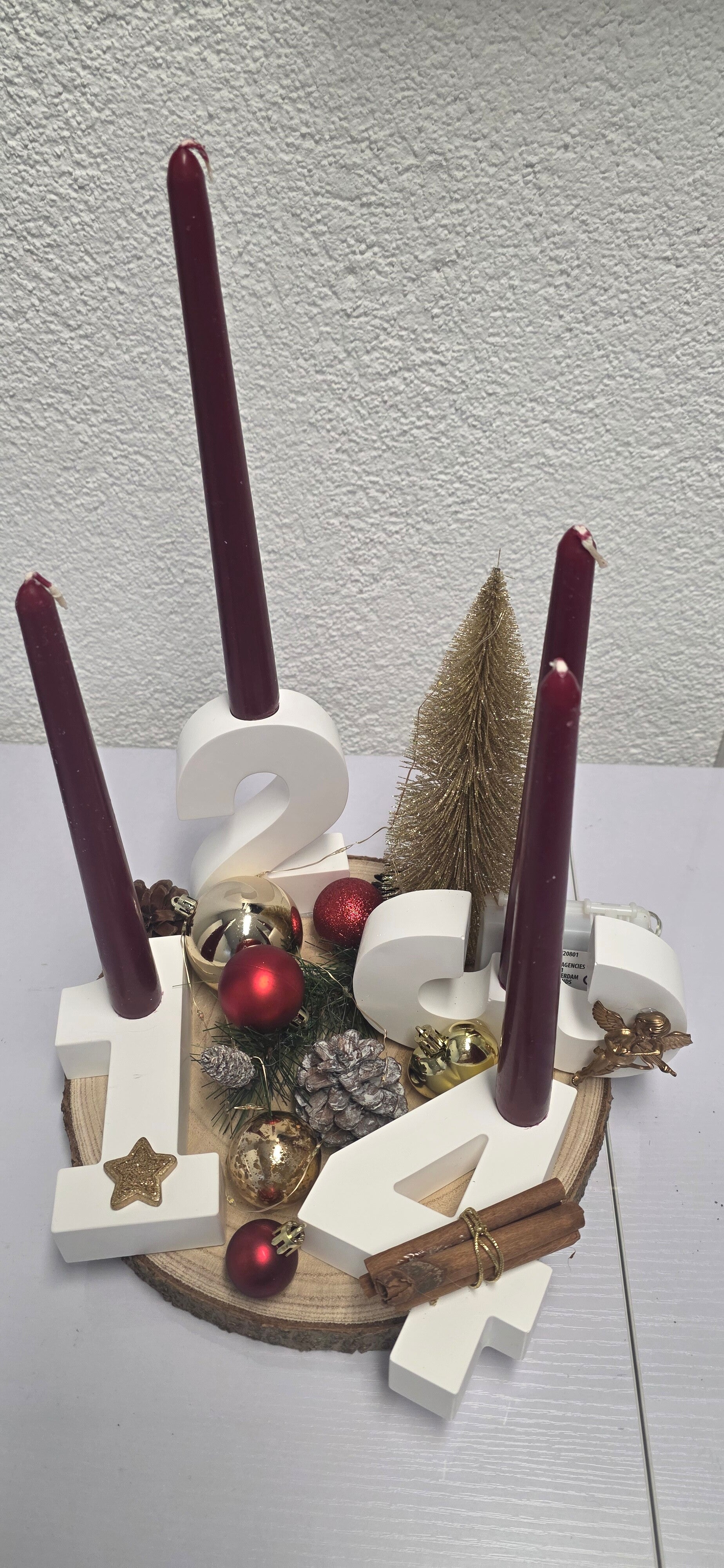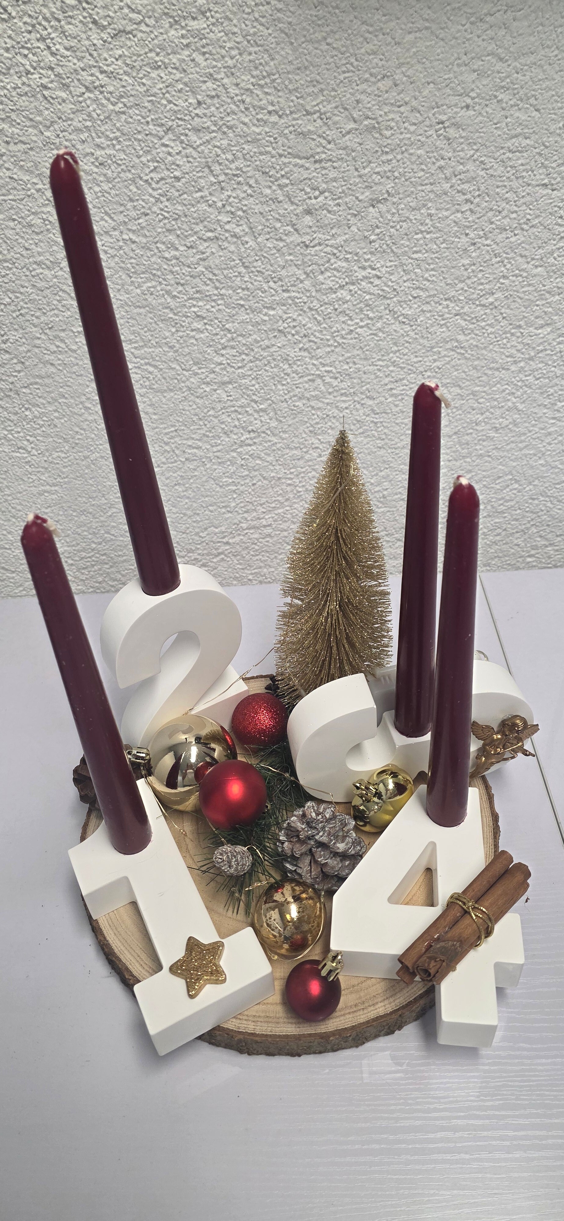Bringe festliche Wärme in dein Zuhause mit unserem handgefertigten Adventskranz in klassischen Rot und Goldtönen. Vier elegante Kerzen erstrahlen in sattem Rot und harmonieren perfekt mit goldenen Details, die für funkelnde Akzente sorgen.