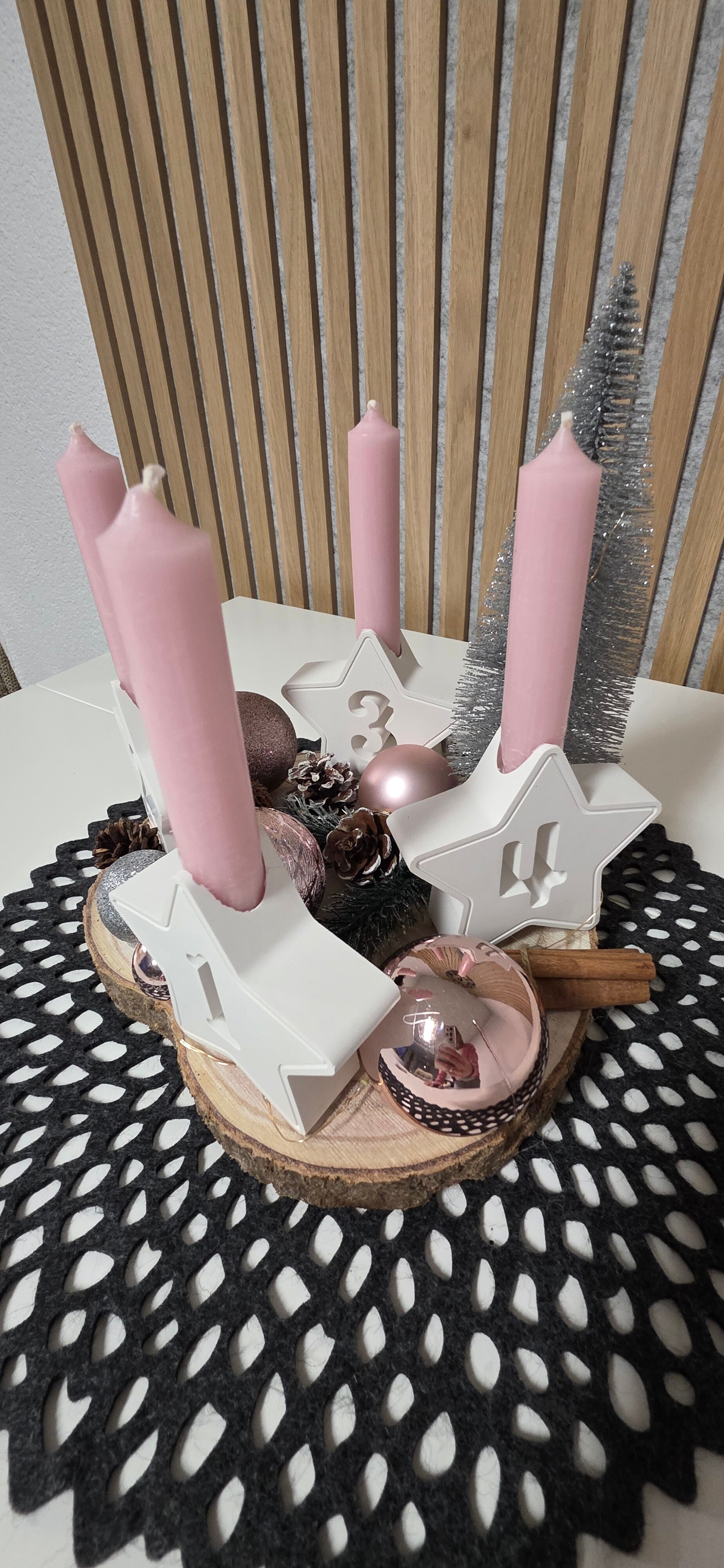 Dieser elegante Adventskranz kombiniert sanftes Rosé mit edlen Silberakzenten und schafft eine festliche, moderne Atmosphäre. Die vier Kerzen stehen in sternförmigen Kerzenhaltern, die jeweils eine eingearbeitete Zahl tragen – 1, 2, 3 und 4 – und so stilvoll durch die Adventssonntage führen.